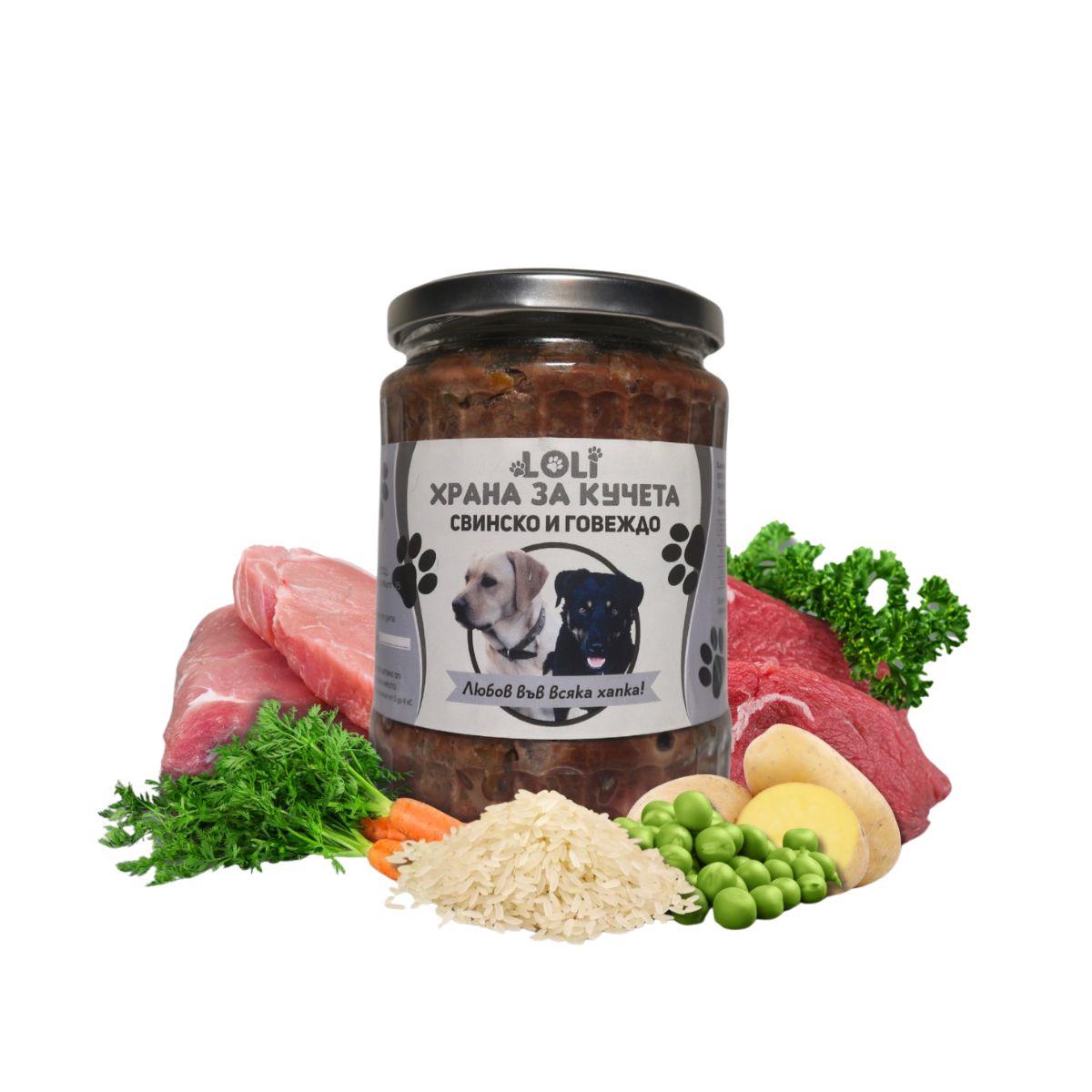 Домашна храна за кучета с Говеждо, Свинско и Зеленчуци – LOLI буркан 500 г