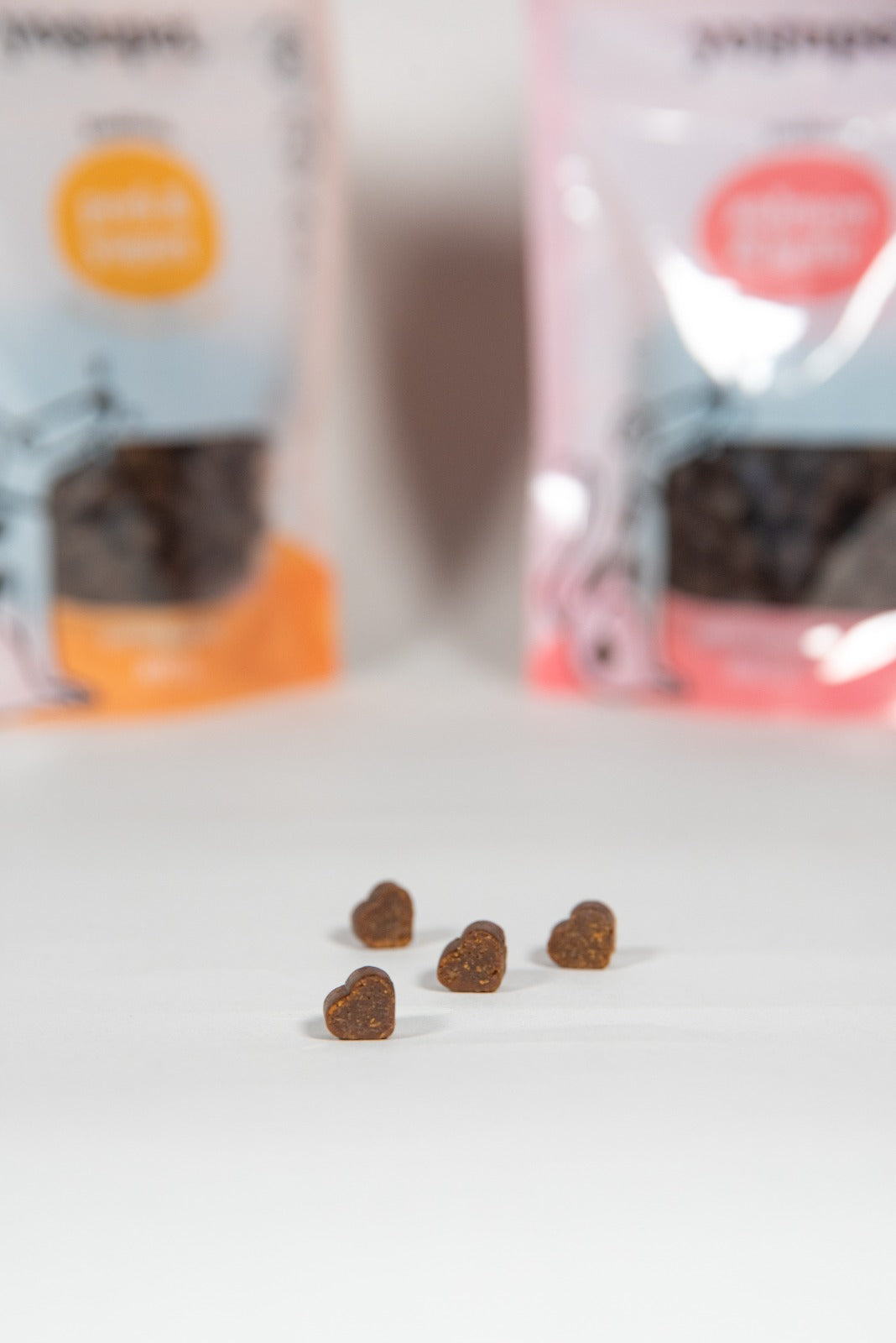 Неустоими полувлажни хапки във формата на сърчица, създадени да съчетаят изключителен вкус и функционални ползи за здравето. Комбинацията от пушена сьомга и пастьоризиран кефир без лактоза прави тези лакомства перфектна ежедневна награда за кучета от всички породи и възрасти.